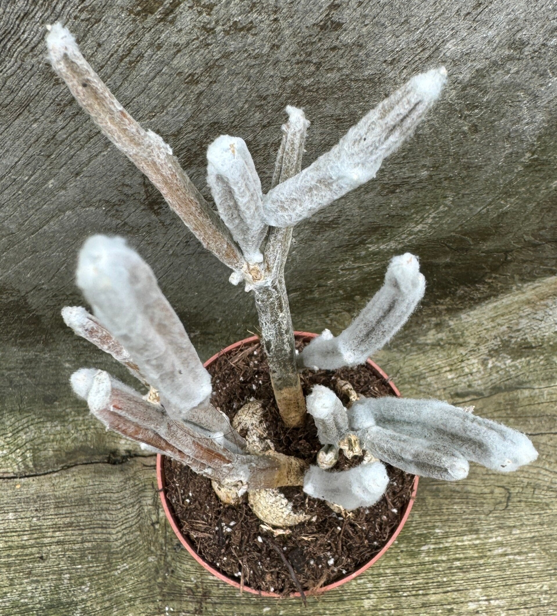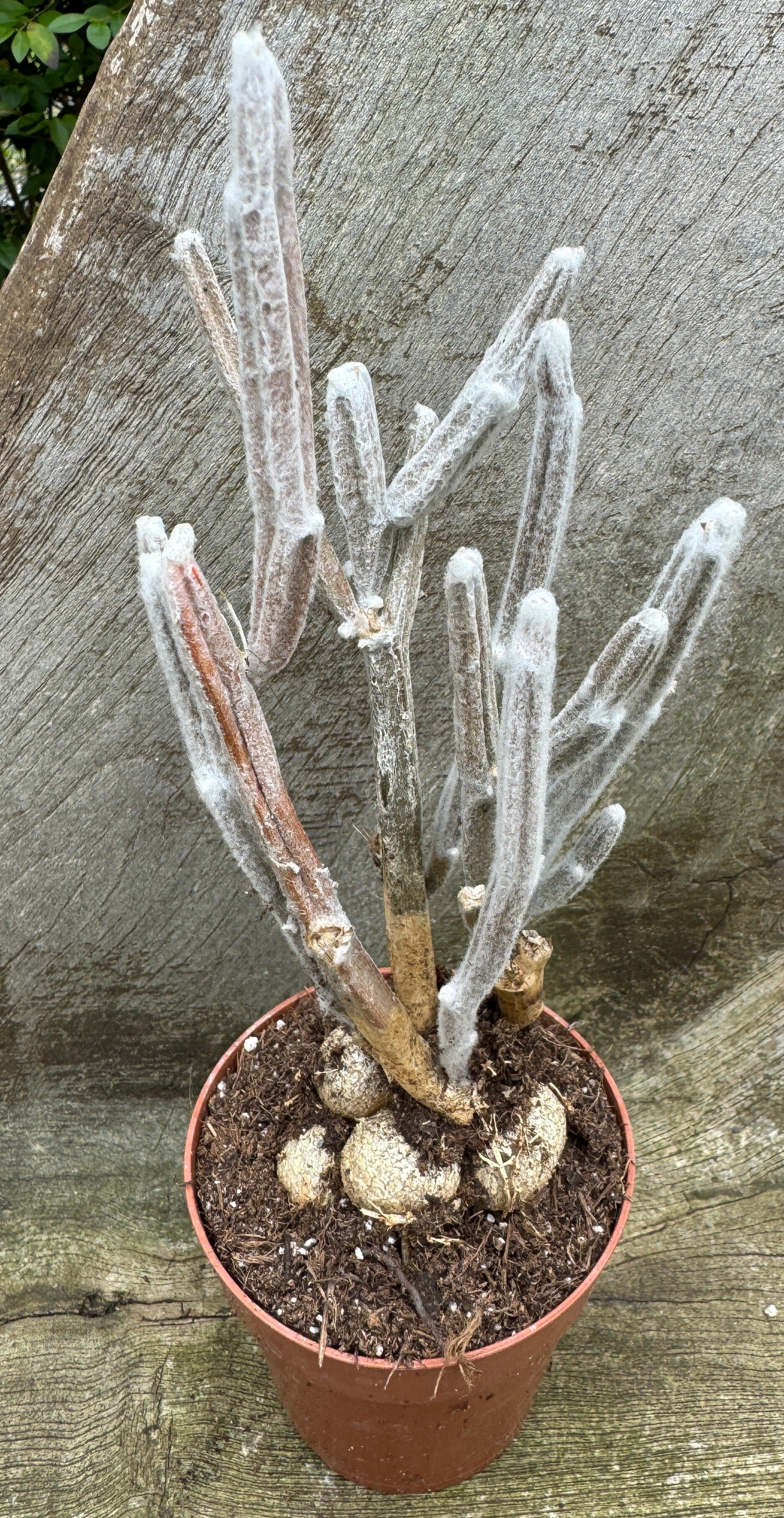 U krijgt een mooie soortgelijke plant als op de foto's. De plant is goed geworteld en staat in een pot met een diameter van circa 8 cm en heeft een mooie caudex.