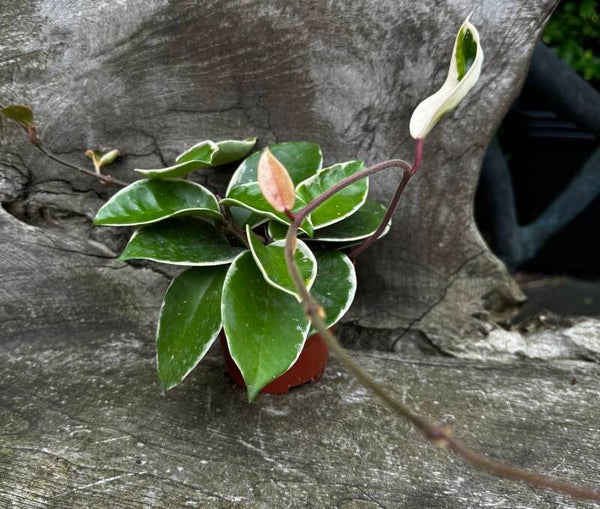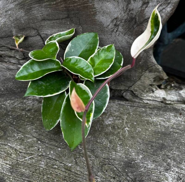 De Hoya Carnosa Krimson Queen staat bekend om zijn opvallende bladeren met een mix van groen en crèmekleurige strepen, waardoor het een aantrekkelijke toevoeging is aan elke kamer.