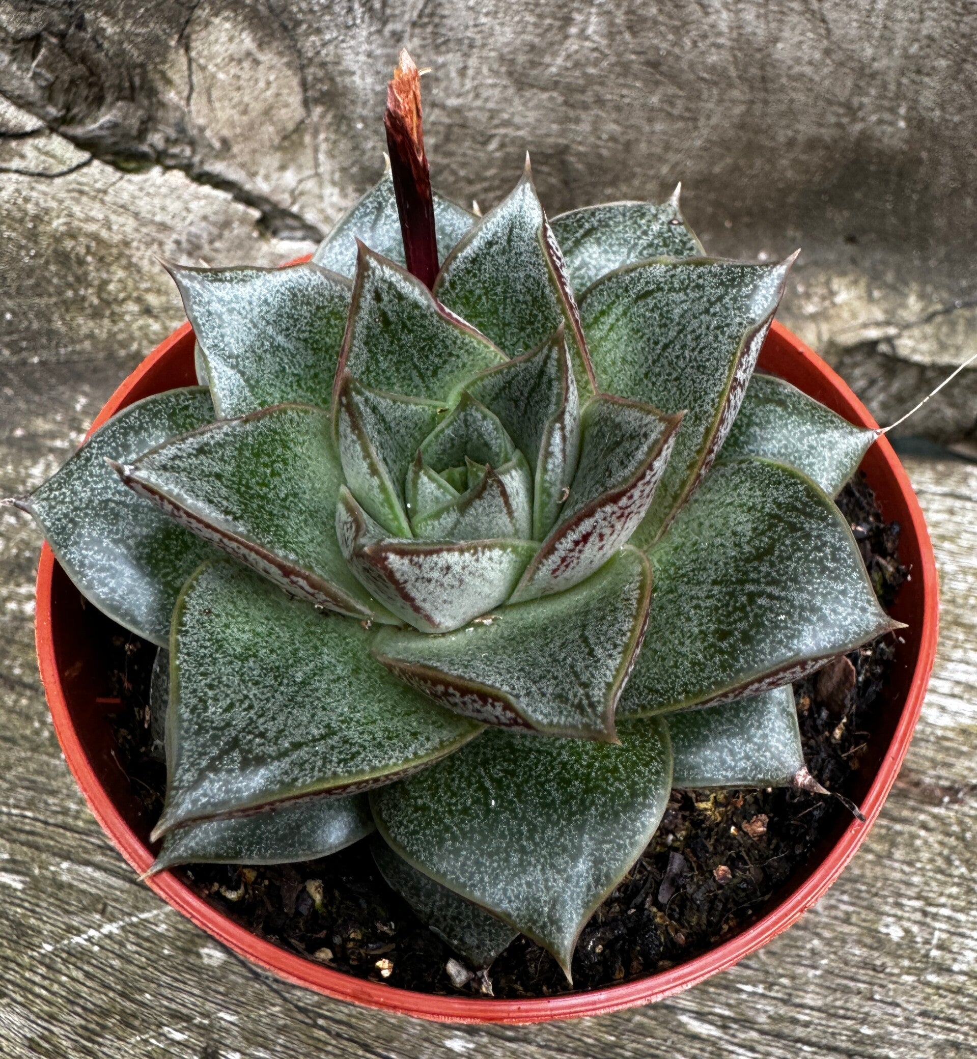 Echeveria Purpusorum heeft kleine, dichte rozetten die meestal niet groter worden dan 8 cm in diameter. De bladeren zijn dik en vlezig, met een donker groene kleur en roodachtige vlekken. De bladeren hebben een puntige vorm en een licht glanzende textuur.Deze Echeveria produceert kleine, klokvormige bloemen die rood of oranje van kleur zijn, vaak met gele accenten. De bloemen groeien aan lange, slanke stelen die uit het midden van de rozet opstijgen.