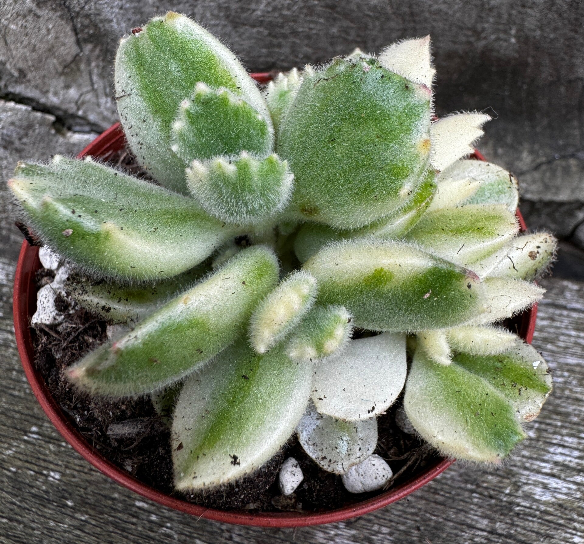 Een interessant feitje over Cotyledon Tomentosa Variegata is dat de uiteinden van de bladeren vaak rood kleuren, wat doet denken aan berenklauwen met scherpe nagels. Dit unieke kenmerk, samen met de bonte (variegata) bladkleur, maakt het een zeer gewilde plant onder vetplantliefhebbers