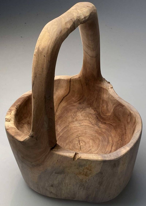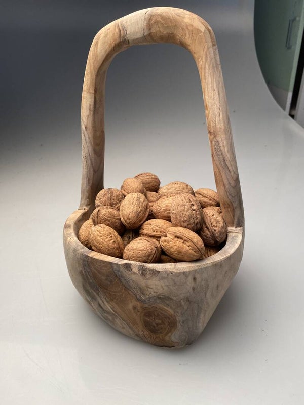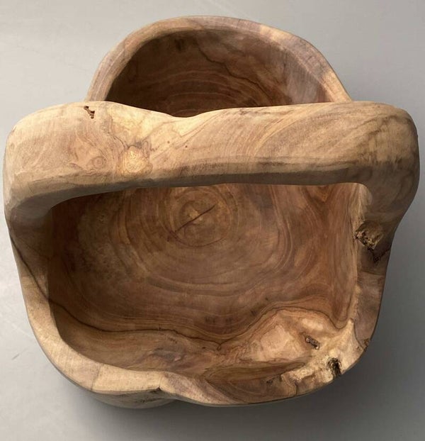 Robuust teakhouten schaal met handvat uit 1 stuk hout gesneden. Door het gebruik van teak hout heeft de schaal een mooie en robuuste look. Deze robuuste look wordt nog eens versterkt door de vorm en manier waaruit de schaal uit 1 stuk hout gesneden is.