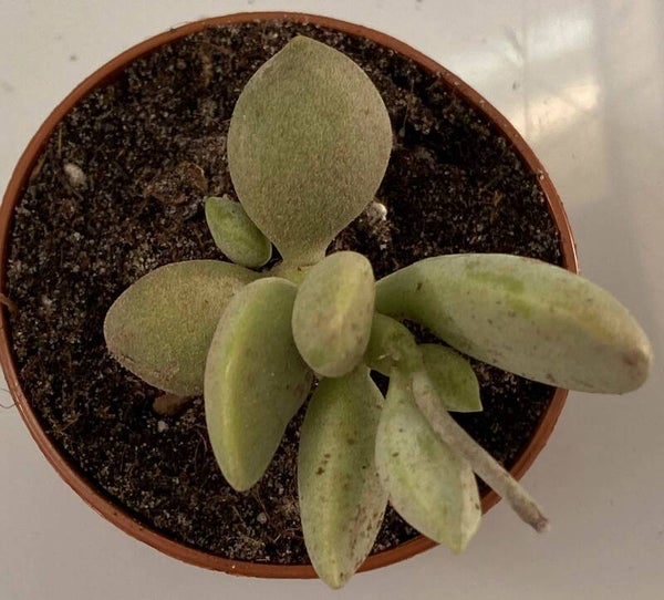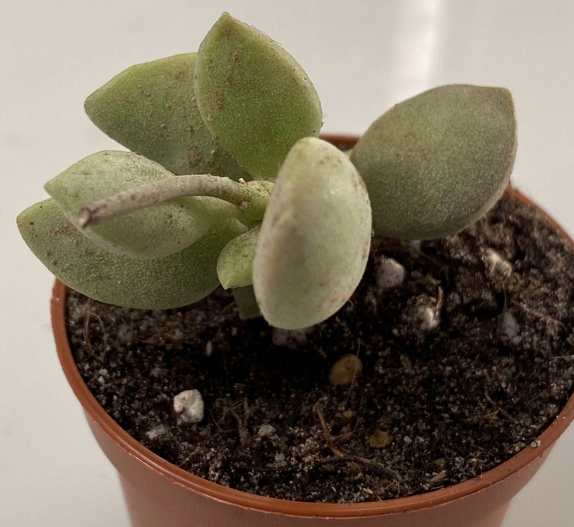 De Adromischus Filicaulis heeft mooie dikke vlezige langwerpige bladeren met een lichtgroene kleur.