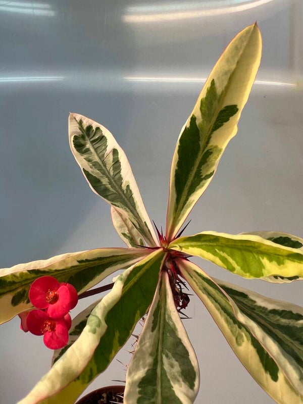 Euphorbia milii variegata heeft stengels met doornen en bonte bladeren. De stekels zijn scherp en dienen als bescherming voor de plant. De bloemen van Euphorbia milii variegata zijn klein en hebben levendige kleuren, variërend van rood, roze, geel tot oranje. Ze vormen karakteristieke schutbladen rond de bloem.
