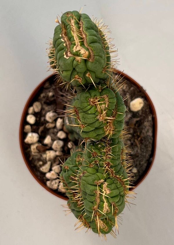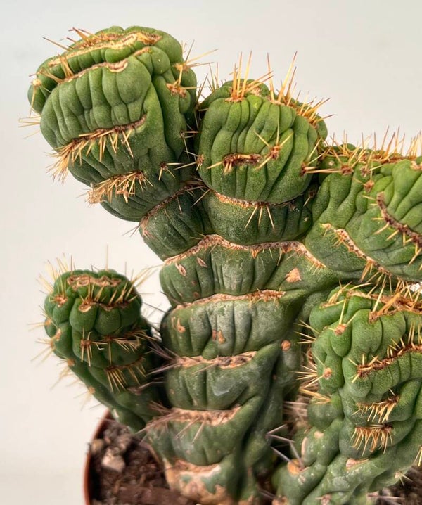 Een interessant feit over de Eulychnia castanea cv Spiralis Cristata is dat het een bijzondere en zeldzame variëteit betreft, gekenmerkt door zijn opvallend golvende en kronkelende stengels die zich onderscheiden van de normale vorm van de soort.