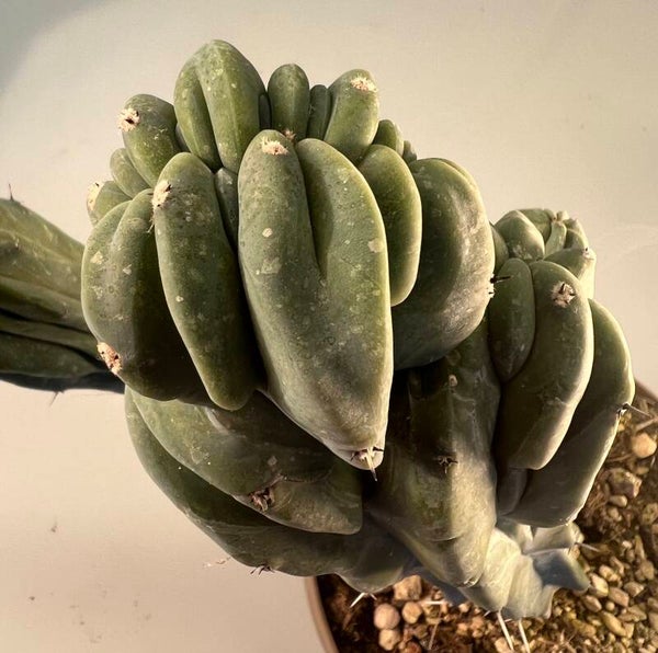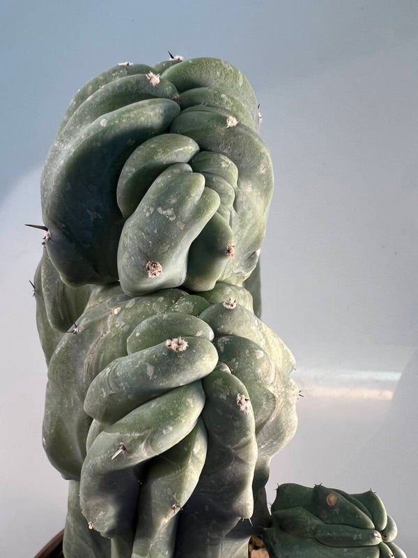 Deze cactus staat bekend om zijn grillige, gecristalliseerde groeiwijze en blauwgroene stengels, wat hem visueel zeer aantrekkelijk maakt voor cactusliefhebbers.